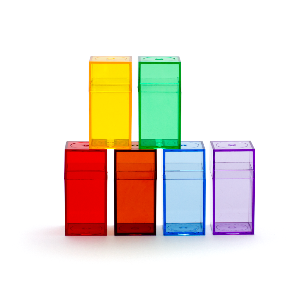 Let your imagination run wild with this assortment of plastic gift boxes, colors and sizes available through AcrylicGiftware.Com and they are all  made from a non-BPA, food grade plastic. This series measures 1 3/16" square by 2 7/16" tall and includes a tall cap that creates an almost waterproof seal. Use as table toppers or centerpiece without the cap or fill with candy, flowers, colorful stones or other decorative accents or gift wrap with ribbon and a bow, these beautiful gift boxes are truly economical and limitless in use. Sold in bulk for the savings, the boxes can be optionally personalized with corporate identification and logos, for Bar or Bat Mitzvahs, weddings or special events.