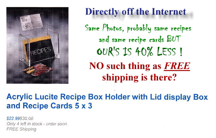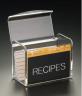 Our 5x3 Acrylic Recipe Box comes with lined recipe cards as shown here. Manufactured from high-impact resistant clear acrylic, the hinged lid stays with the box and can act as a card holder while you shake or bake while the clear acrylic container makes it truly easy to find just about anything you need at a glance. Approximately 50 recipe cards included.